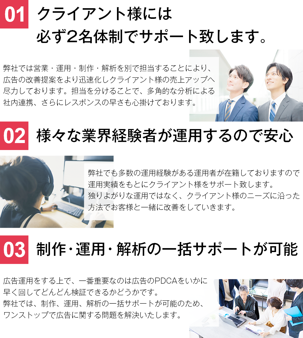 YouTube広告を中心とする動画広告を筆頭に様々な運用型の広告から時代にあった最適な媒体を提案し経験豊富な担当者が運用します。